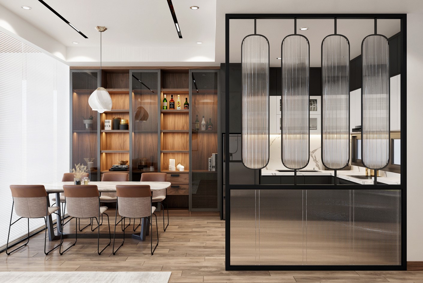 Ngoài ra, kim loại còn được ứng dụng sáng tạo trong các thiết kế vách ngăn và tấm ốp tường. Những bề mặt kim loại với họa tiết hoặc màu sắc đa dạng không chỉ giúp phân chia không gian mà còn tạo hiệu ứng thị giác độc đáo, phù hợp với nhiều phong cách từ tối giản đến sang trọng.