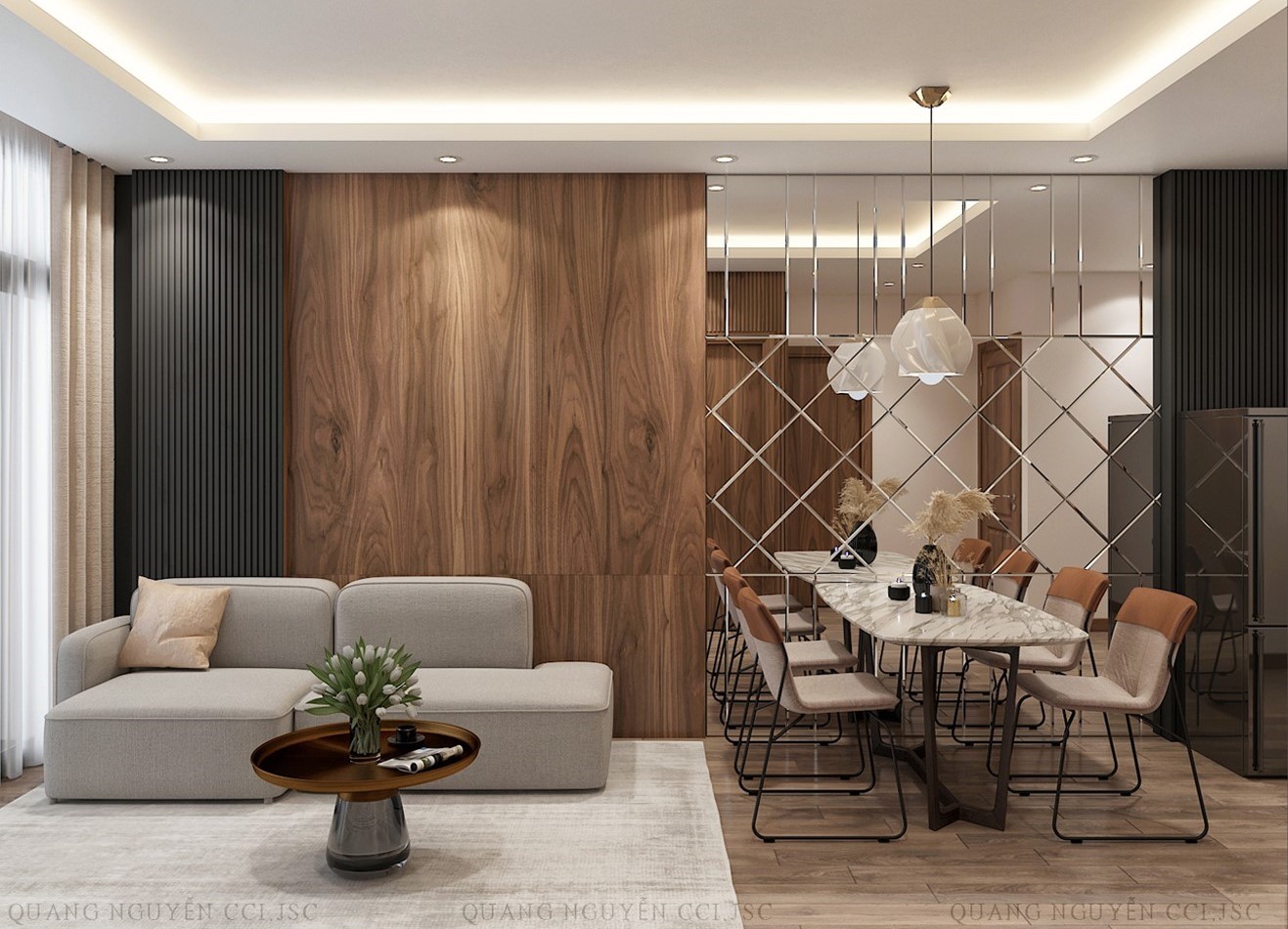 Điểm đặc trưng dễ nhận thấy nhất của kim loại trong nội thất chính là khả năng phản chiếu ánh sáng. Chính yếu tố này giúp không gian trở nên sáng hơn, rộng hơn và có chiều sâu hơn, đặc biệt phù hợp với các căn hộ hiện đại hoặc những khu vực cần tối ưu ánh sáng tự nhiên. Không chỉ dừng lại ở hiệu ứng thị giác, kim loại còn mang đến cảm giác chắc chắn và gọn gàng thông qua các đường nét dứt khoát, góp phần định hình phong cách thiết kế rõ ràng cho tổng thể không gian.