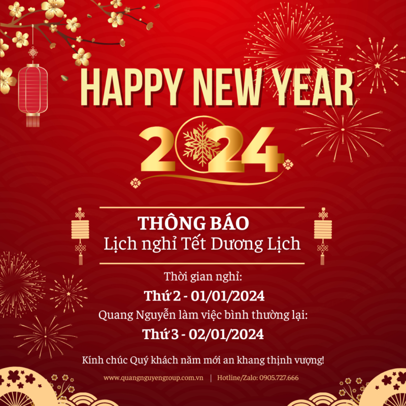 Để không làm gián đoạn các dịch vụ cho Quý khách hàng, đối tác trong thời gian vui xuân, Quang Nguyễn trân trọng thông báo lịch nghỉ Tết Nguyên Đán như sau: